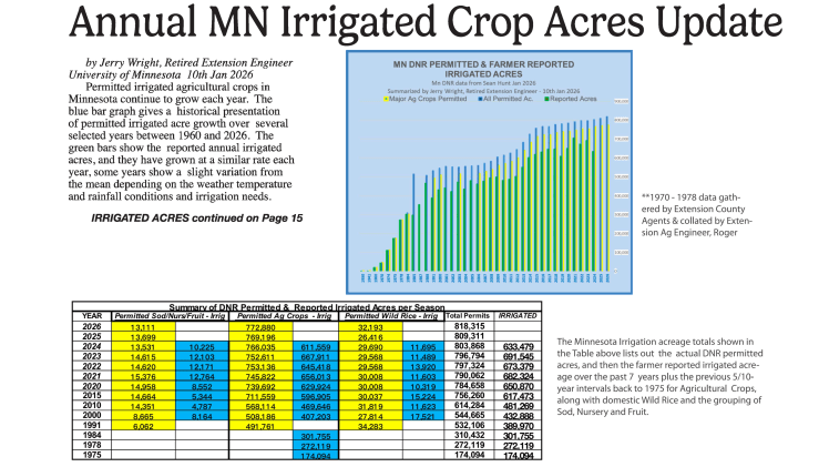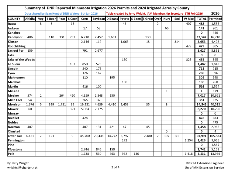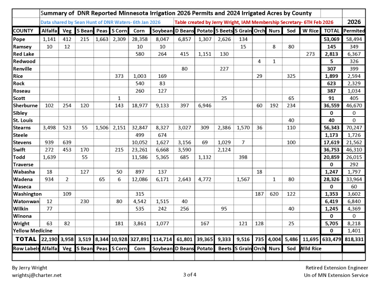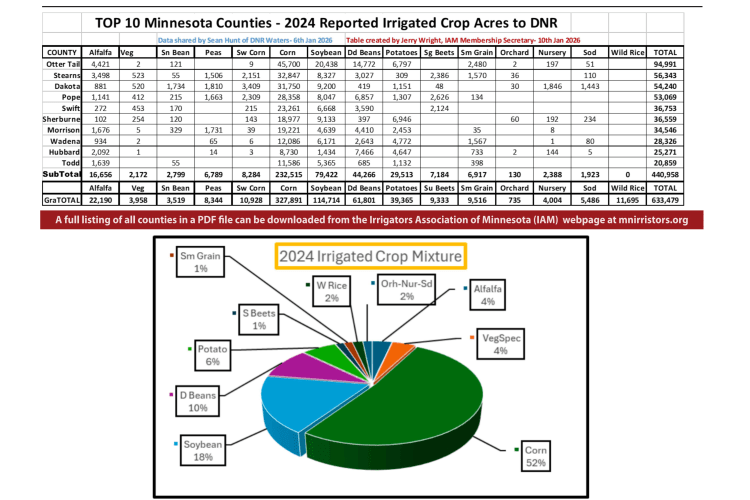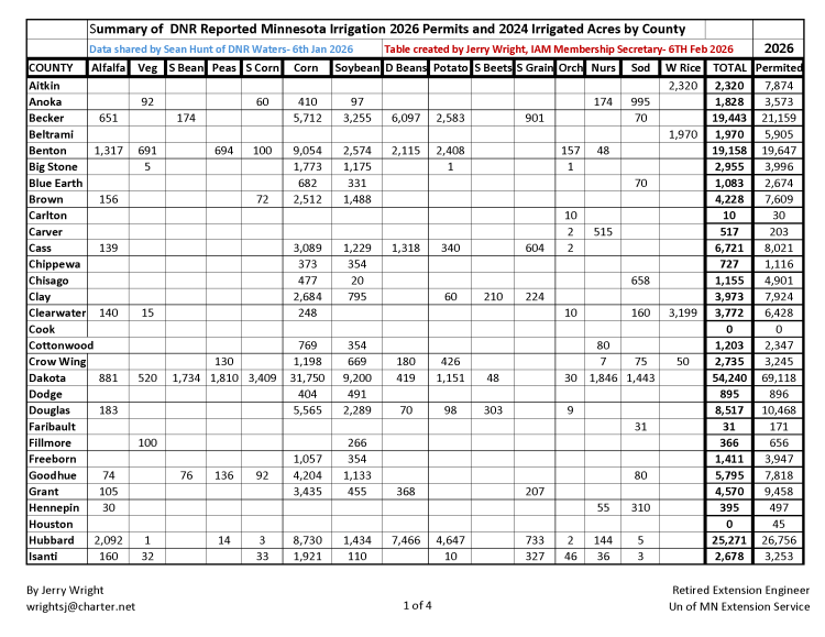 The summary, prepared by retired University of Minnesota Extension irrigation engineer Jerry Wright using DNR data shared by Sean Hunt of Minnesota Department of Natural Resources Waters, provides a county-by-county snapshot of irrigated acres and permitted irrigation activity based on 2024 crop acreage and 2026 water use permits.