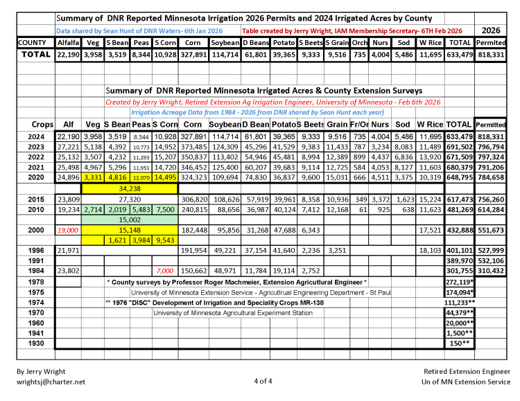 The summary was compiled by Jerry Wright, IAM Membership Secretary, using annual DNR irrigation acreage data dating back to 1984, in collaboration with the University of Minnesota Extension and the Irrigators Association of Minnesota.